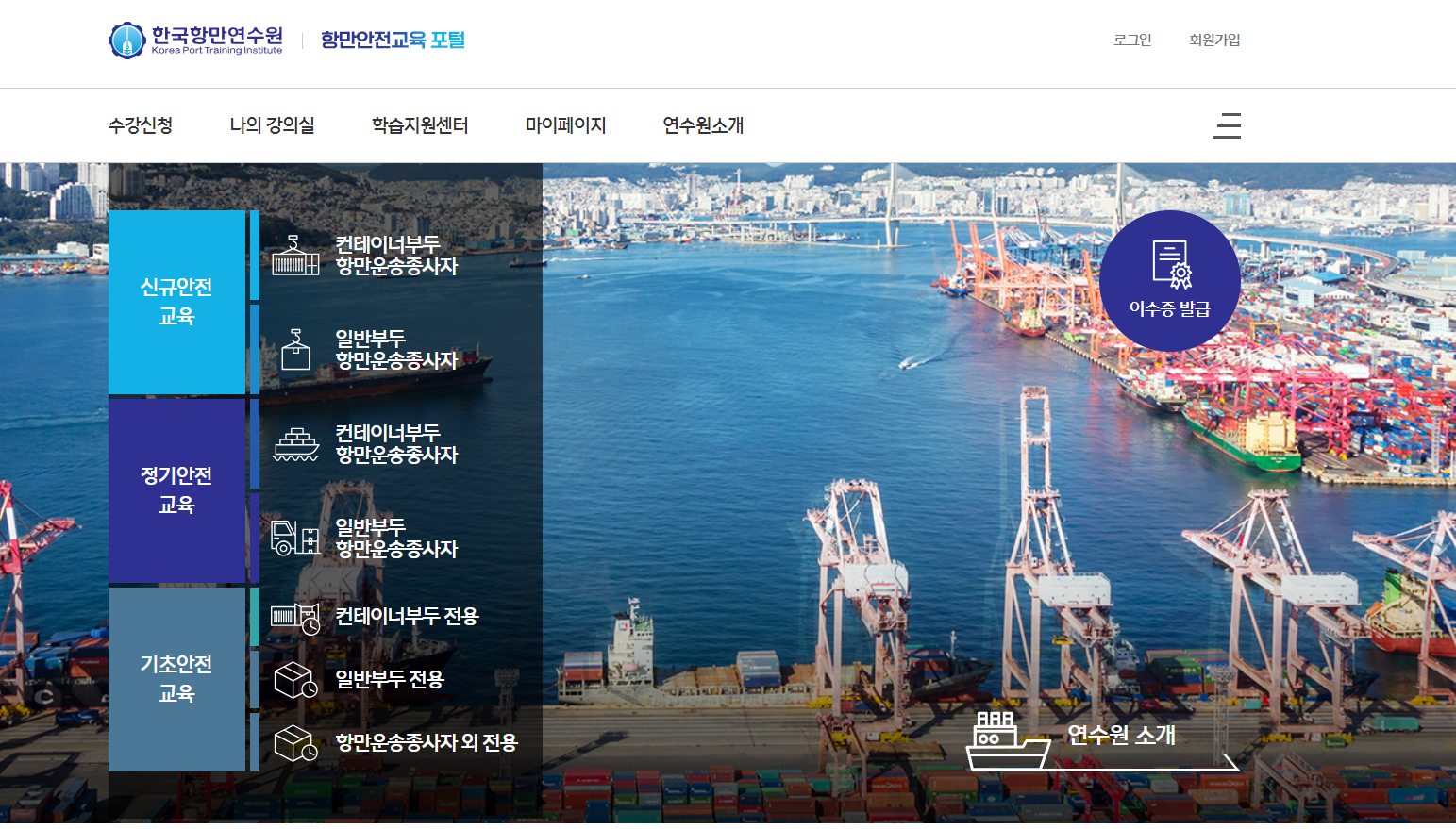 - 수강신청 → 기초안전교육 → 컨테이너부두 / 일반부두 / 항만운송종사자 외 전용 중 선택 → 이수증 출력